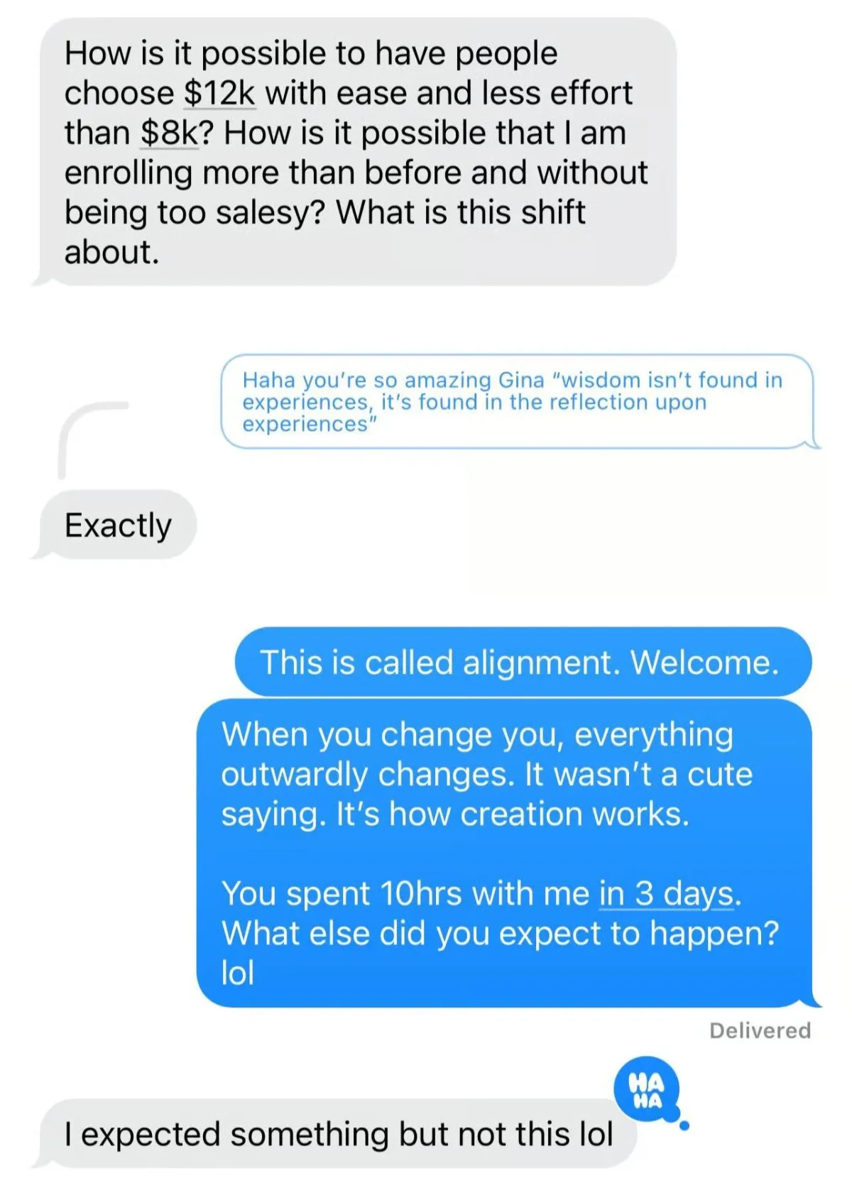It's not about time — it's about depth. Most people spend years in coaching making slow, surface-level progress because they never go to the root. Five days at the root moves more than five years at the surface. Gina called it "collapsing time." Six months of work in five days. That's what happens when there's no distraction, no noise, no agenda except truth.